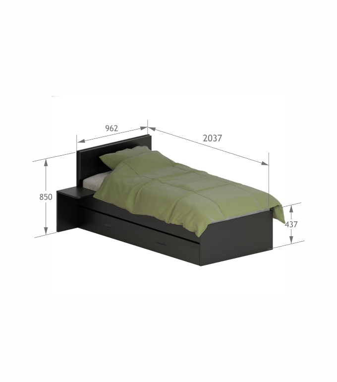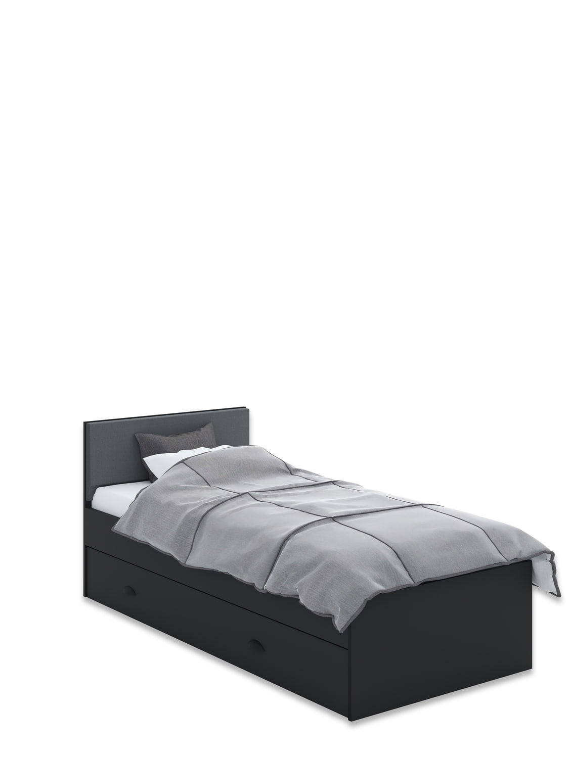 Čelo s měkkým čalouněným panelem v barvě Anthracite. Boky postele vyrobeny z antracitové laminované desky.